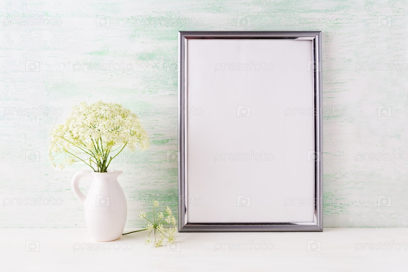 Макет серебряной рамки с нежными полевыми цветами в кувшине