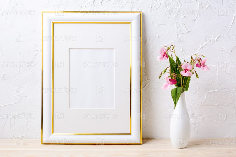 Золотой макет рамки с букетом цветов в элегантной вазе