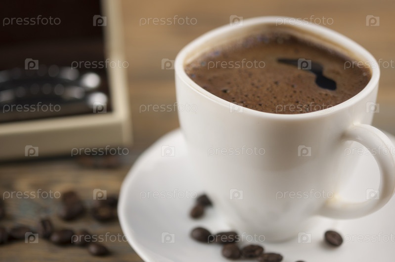 Чашка кофе с бабочкой и подарочной коробкой на старом деревянном столе с фасолью. Открытка на день отца