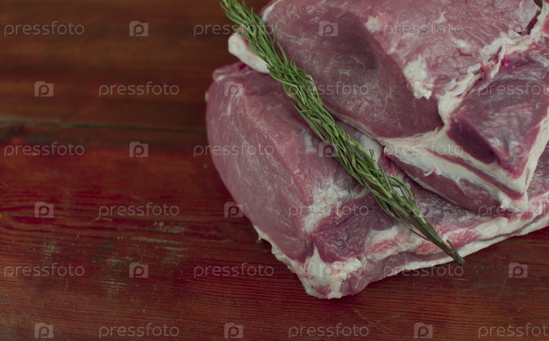 Кусок сырой свинины на деревянном столе. Свиная вырезка со специями и розмарином на деревянном фоне. крупный план, копирайт