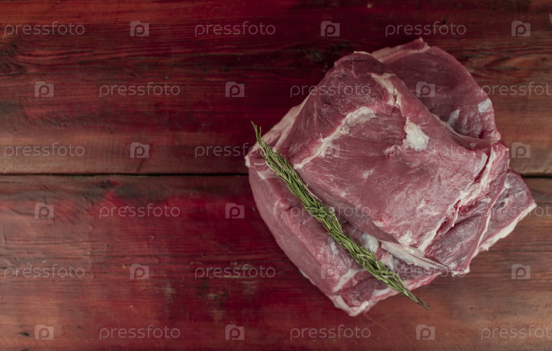 Кусок сырой свинины на деревянном столе. Свиная вырезка со специями и розмарином на деревянном фоне. крупный план, копирайт