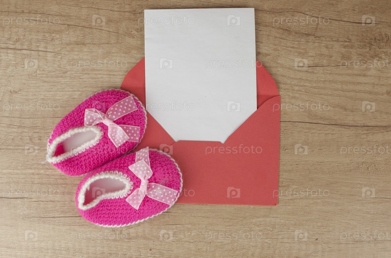Красочные ручной вязки детские туфли и конверт с чистым листом бумаги на деревянной столешнице