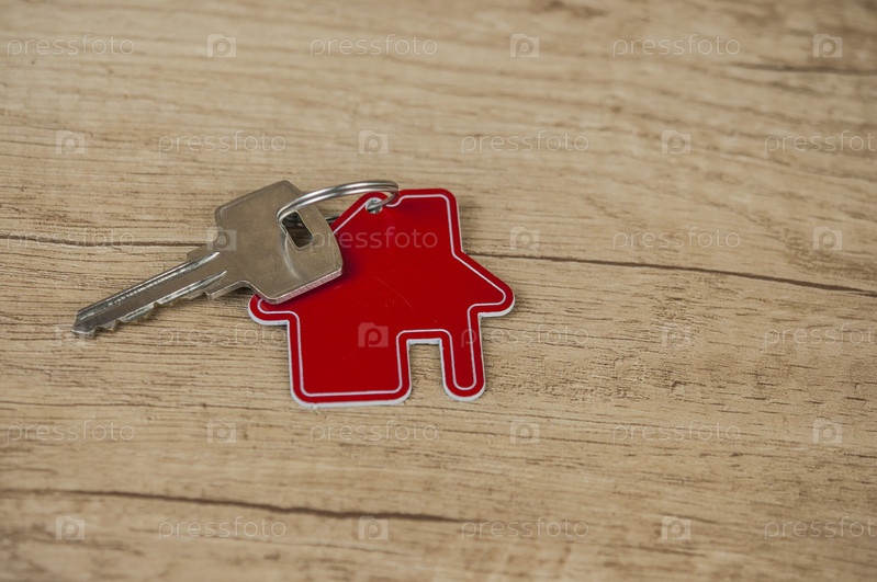 Расположение брелка в форме ключа и дома на деревянном фоне. Недвижимость, концепция страхования, ипотека, покупка дома, концепция риэлтора