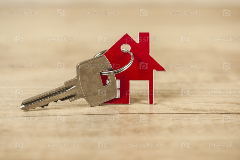 Расположение брелка в форме ключа и дома на деревянном фоне. Недвижимость, концепция страхования, ипотека, покупка дома, концепция риэлтора