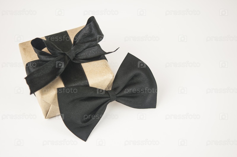 Одна подарочная коробка, завернутая в крафт-бумагу с галстуком-бабочкой на белом фоне. Концепция День отца или день рождения фон. Вид сверху. Концепция международного мужского дня