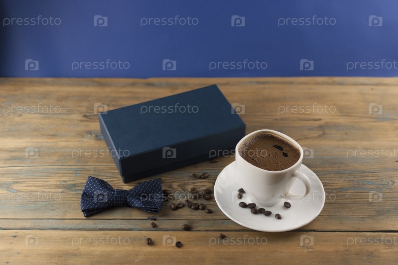 Чашка кофе с бабочкой и подарочной коробкой на старом деревянном столе с фасолью. Открытка на день отца