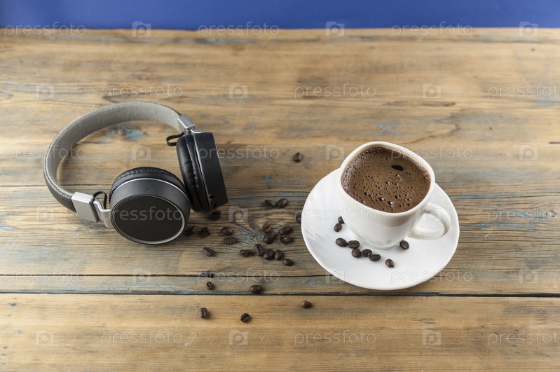 Чашка кофе с жареными бобами на деревянном столе