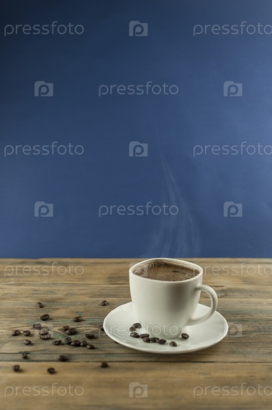 Чашка кофе с жареными бобами на деревянном столе