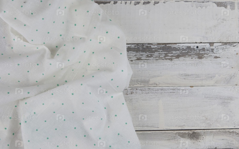 Текстиль в зеленый горошек на фоне белого деревянного стола. Деревянный стол с белой тканью