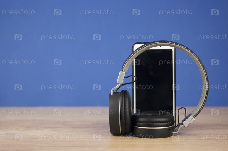Черные наушники и смартфон на деревянном столе на синем фоне обоев