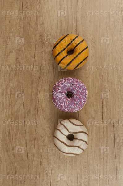 Красочные пончики или пончик на фоне деревянного стола. Вид сверху
