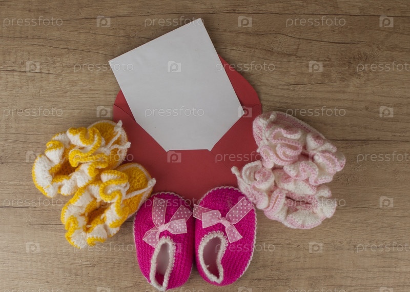 Красочные ручной вязки детские туфли и конверт с чистым листом бумаги на деревянной столешнице
