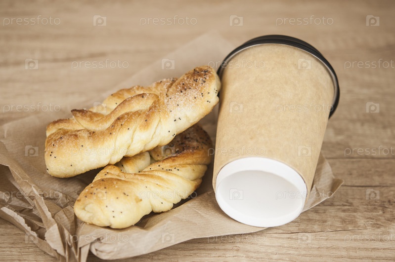 Две булочки с маком с кофейной чашкой на деревянном столе. Завтрак. Доброе утро