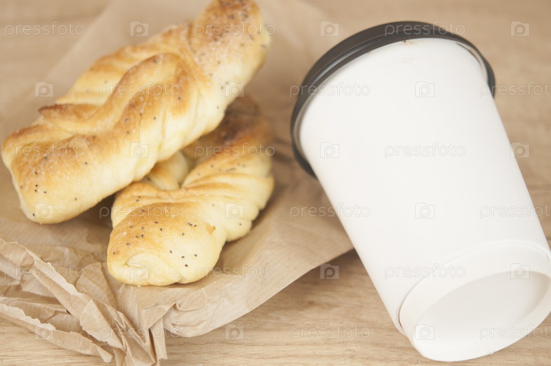 Две булочки с маком с кофейной чашкой на деревянном столе. Завтрак. Доброе утро