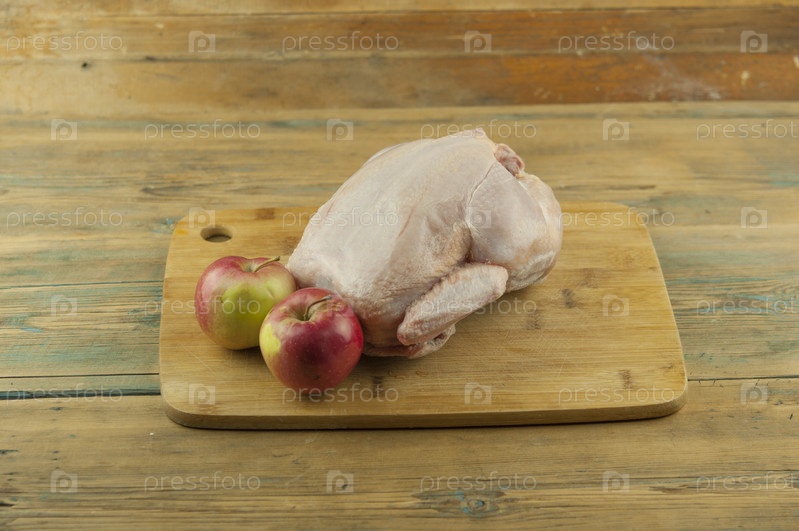 Замороженная куриная тушка на деревянной разделочной доске