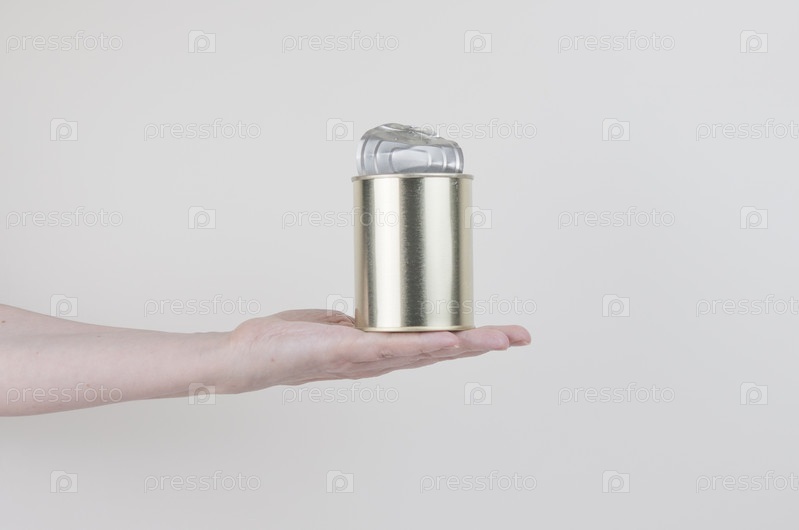 Женская рука держит консервную банку