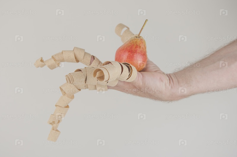 Мужская рука держит резьбу по дереву, стружки и грушу