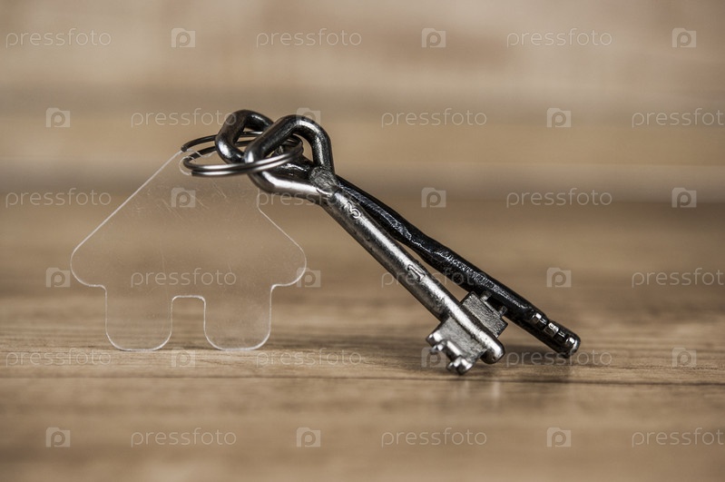 Расположение брелка в форме ключа и дома на деревянном фоне. Недвижимость, концепция страхования, ипотека, покупка дома, концепция риэлтора