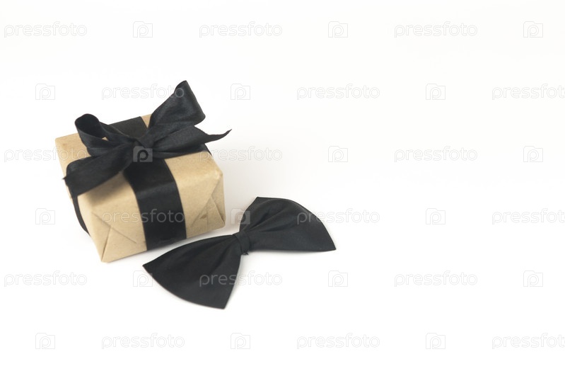 Одна подарочная коробка, завернутая в крафт-бумагу с галстуком-бабочкой на белом фоне. Концепция День отца или день рождения фон. Вид сверху. Концепция международного мужского дня