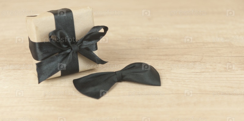 Одна подарочная коробка, завернутая в крафт-бумагу и перевязанная бантом на деревянном фоне. Концепция День отца или день рождения фон. Вид сверху. Концепция международного мужского дня