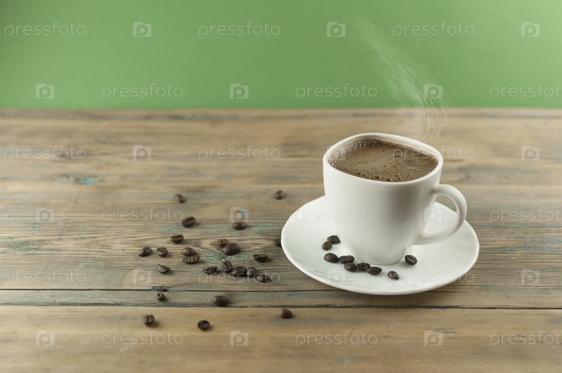 Чашка кофе с жареным кофейными зернами на деревянном столе
