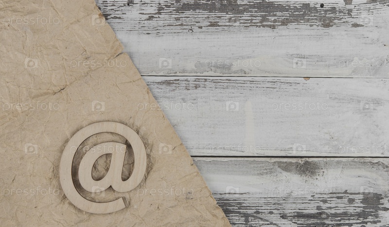 Знак электронной почты на старом белом дереве лежит на старинном деревянном столе. Концептуальное письмо по электронной почте. Вид сверху с копией пространства