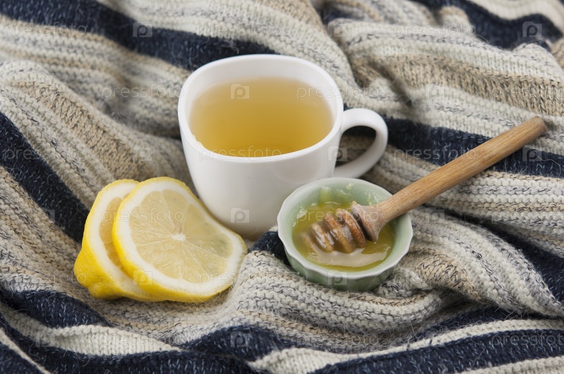 Уютный осенний завтрак с чаем в белой чашке с медом и теплым вязаным свитером