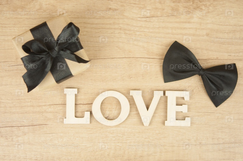 Деревянное слово ЛЮБОВЬ с галстуком-бабочкой и подарочной коробкой на деревянном столе