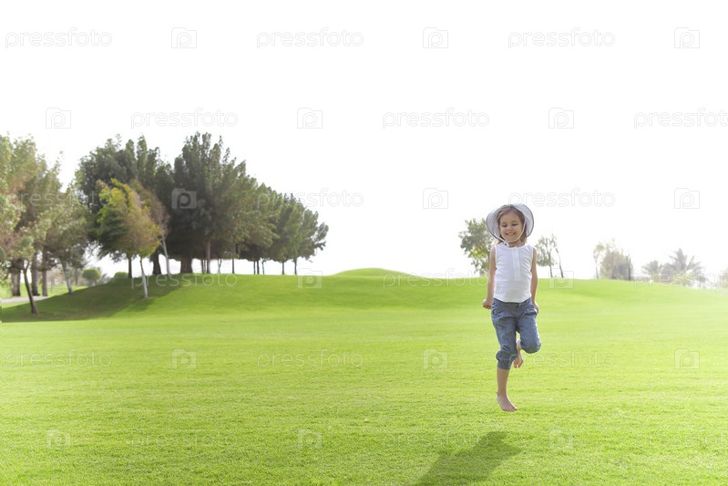 Игривая девушка на зеленой лужайке летом