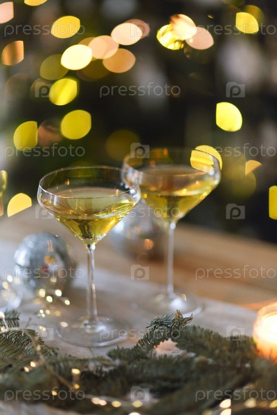 Бокалы игристого вина на деревянном столе на Рождество