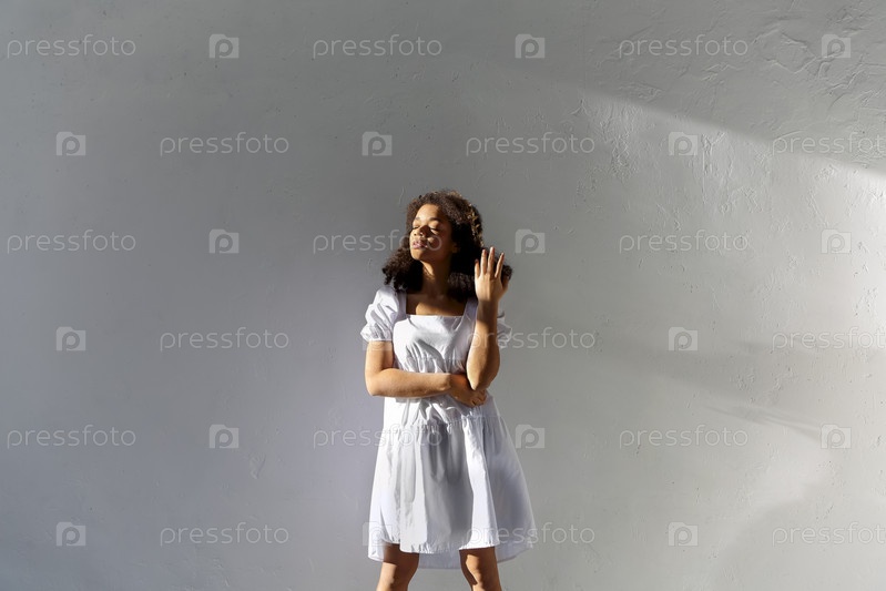 Нежный портрет молодой африканской американки с кудрявой прической, стоящей на солнце в помещении у серой стены