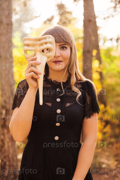 Женщина в карнавальной маске в лесу