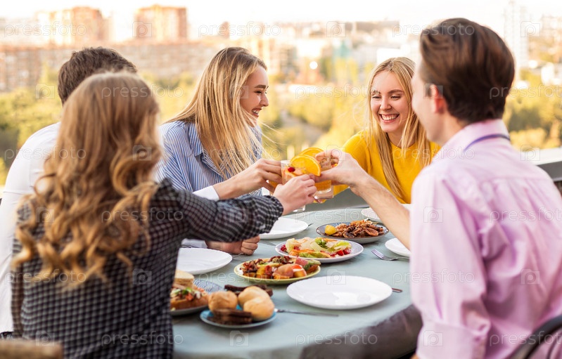 Веселые друзья пьют белое вино во время вечеринки на крыше