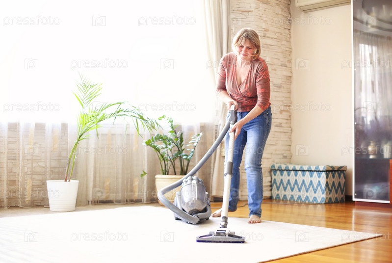 Женщина средних лет с пылесосом дома