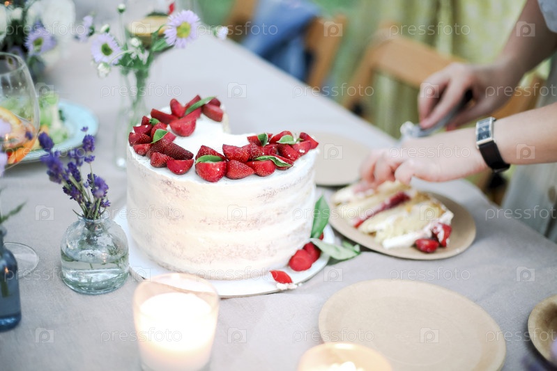 Урожайная женщина режет торт во время банкета