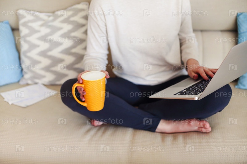 Счастливая женщина-фрилансер с чашкой кофе, работающая с ноутбуком на диване дома