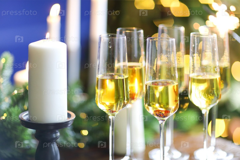 Бокалы игристого вина на деревянном столе на Рождество