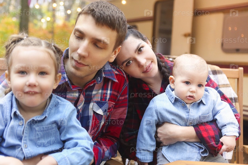 Портрет молодой улыбающейся семьи, обнимающейся возле дома на колесах