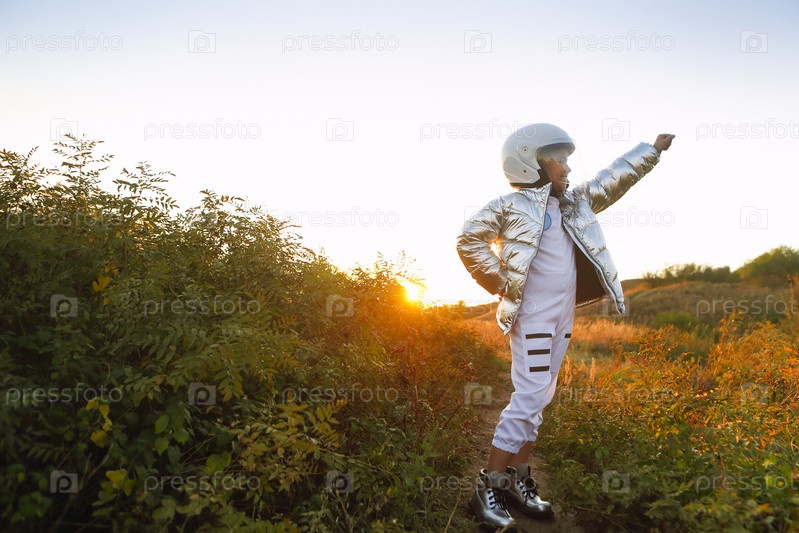 Футуристическая девочка-астронавт в белой полной форме и шлеме в серебряных туфлях на открытом воздухе