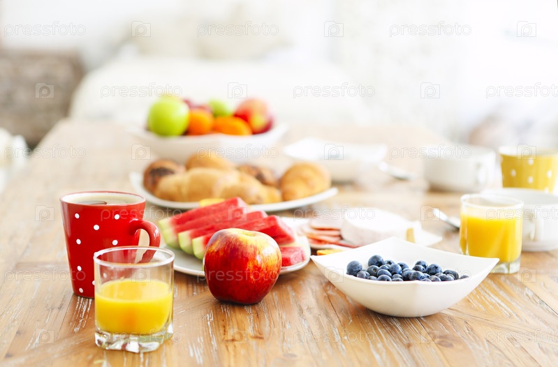 Кофе с фруктами, хлопьями и круассаном на фоне деревянного стола