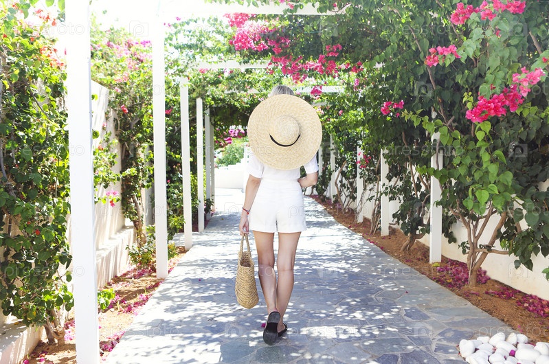 Блондинка в соломенной шляпе перед розовыми цветами бугенвилии