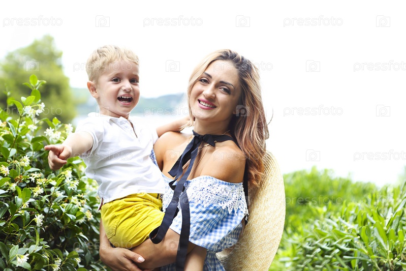 Молодая красивая мать обнимает своего маленького сына на улице. Мама и мальчик веселятся вместе в зеленом саду