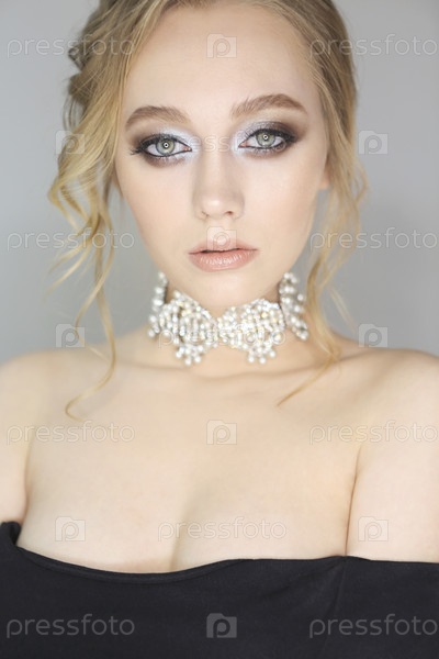 Женщина с модной прической и макияжем. Модный черный кружевной чокер с кристаллами