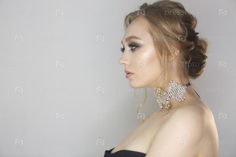 Женщина с модной прической и макияжем. Модный черный кружевной чокер с кристаллами