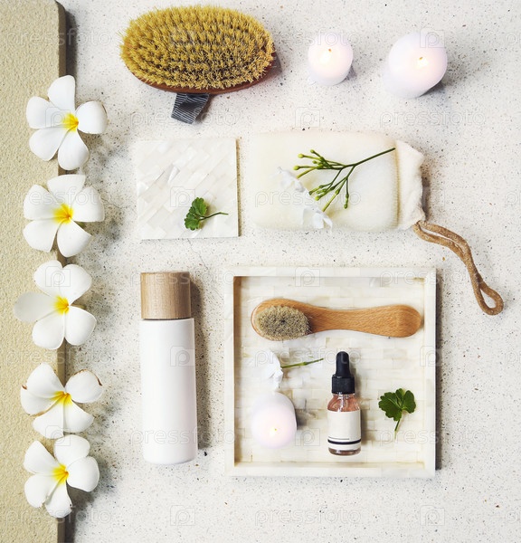 Крем для лица, сыворотка, лосьон, увлажняющий крем и масло для лица среди белого жасмина в ванне