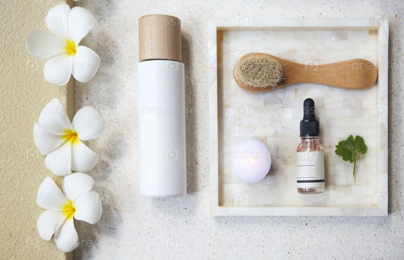Крем для лица, сыворотка, лосьон, увлажняющий крем и масло для лица среди белого жасмина в ванне