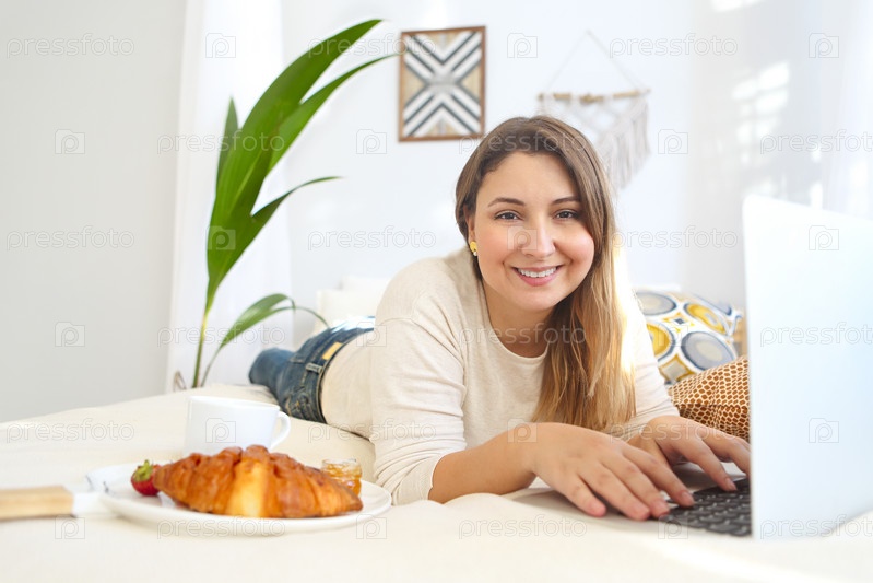 Улыбающаяся женщина-фрилансер работает на ноутбуке и завтракает в постели
