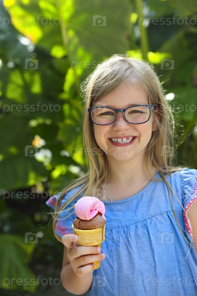 Милая маленькая девочка с забавным выражением лица, держащая рожок мороженого снаружи на фоне яркой природы