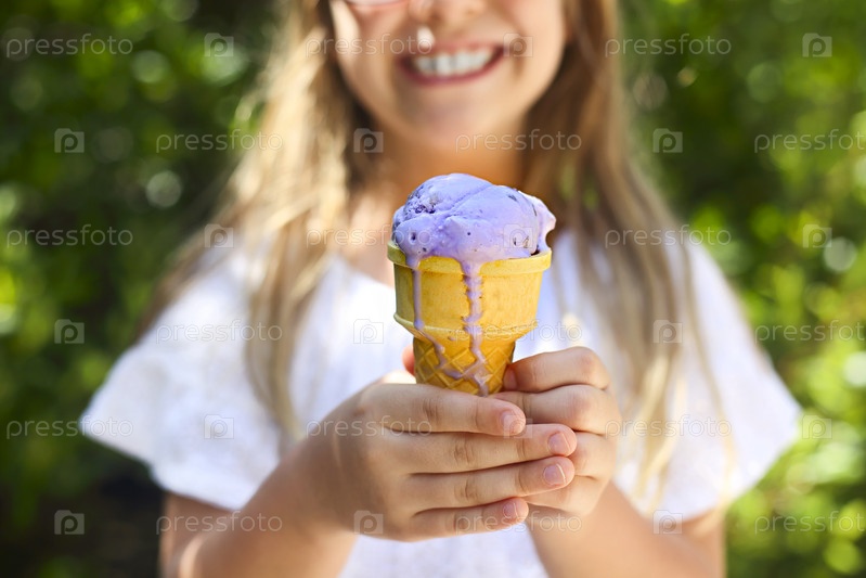 Портрет милой маленькой девочки с забавным выражением лица, держащей рожок мороженого снаружи на фоне яркой природы