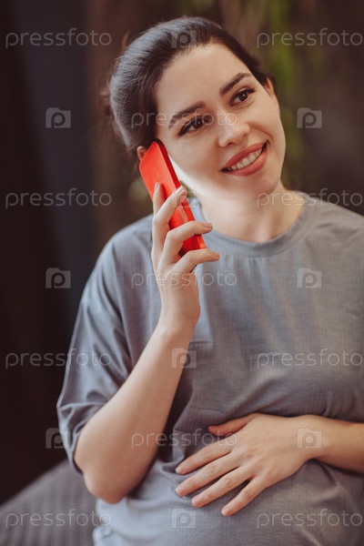 Молодая улыбающаяся беременная женщина трогает живот, разговаривая по мобильному телефону с другом, проводя время дома